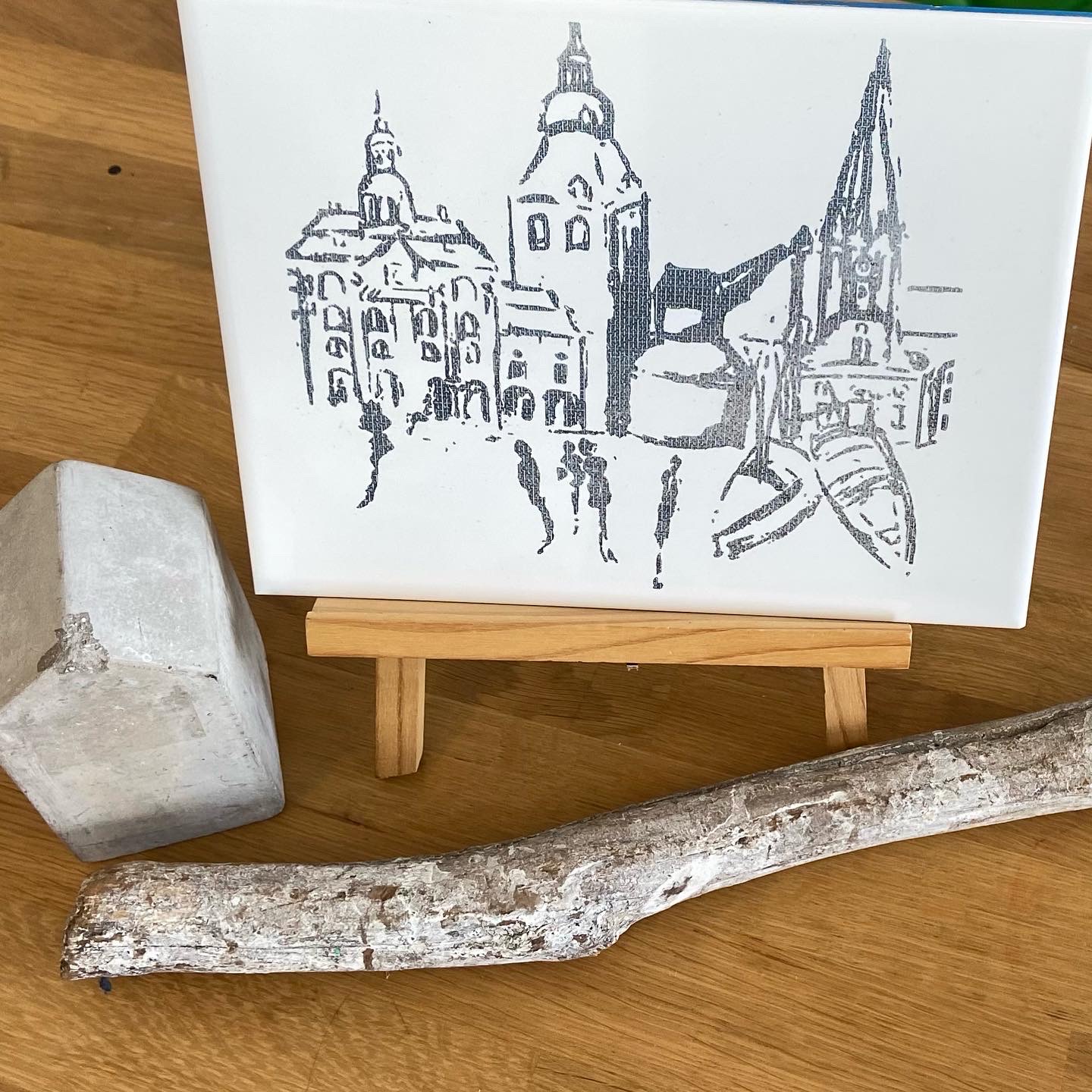 Schöne und dekorative Wandfliese mit einem s/w-Lüneburg-Motiv von Karin Greife in der Größe 25 x 20 cm aus Steinzeug mit Hängeöse auf der Rückseite, limitierte Auflage 50 Stück inkl. einer Fliese mit Blattgold (Nr. 2) , die auf Instagram im Juli 2022 verlost wird. Die Fliesen sind auf der Rückseite nummeriert und von Karin Greife handsigniert.