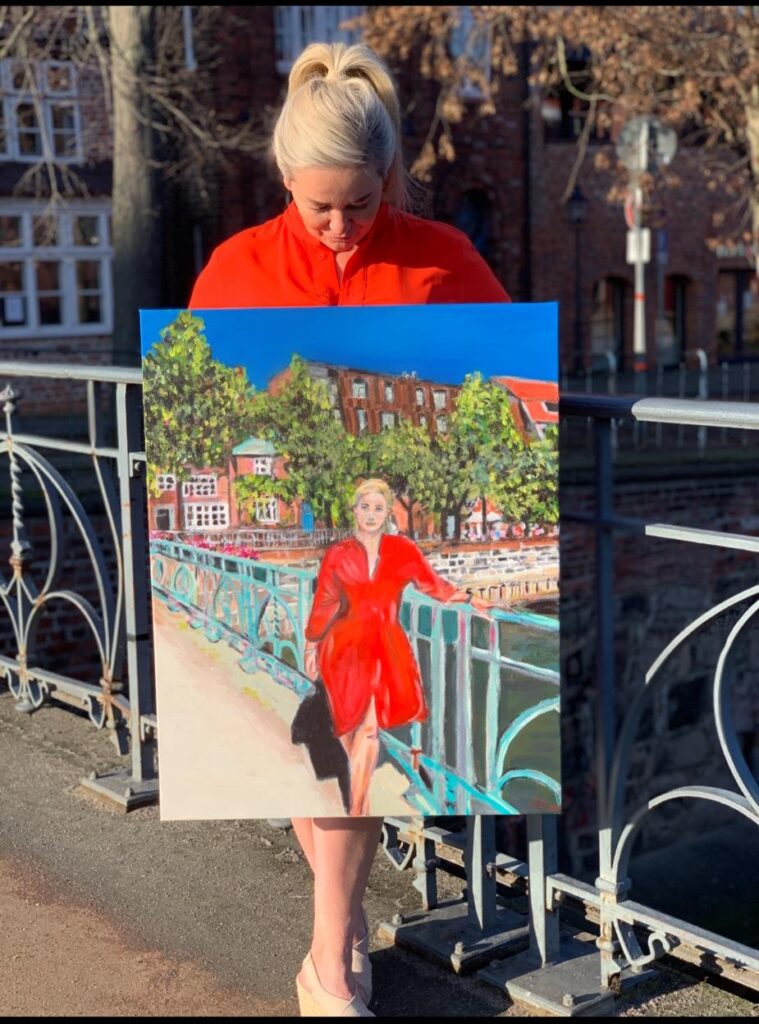 Das siebente meiner Gemälde aus der 12teiligen Serie „Lüneburgerinnen in Lüneburg“ ist fertig! Vorlage war ein schönes Foto von Petra Jacob, die das Geschäft „Fräulein Paula“ Am Berge 50 in Lüneburg betreibt. Sie hat es in kürzester Zeit geschafft, dass ihr Laden mit Café ein beliebter „place to be“ geworden ist. Bei ihr gibt es kulinarische Köstlichkeiten und modische Accessoires sowie eine kleine, aber feine Auswahl an Kleidung. Auf Instagram postet Petra Jacob unter „fraeuleinpaula_lg“ Fotos rund um die Themen Mode, Café, Wein, Geschenkideen und Zubehör für die Hundehaltung. Petra hat selbst einen Labrador und Hunde sind bei ihr immer willkommen. Das Gemälde von ihr auf 60 x 80 cm (die Größe der Bilder ist bei allen 12 Gemälden die gleiche) entstand Anfang 2021 und zeigt Petra in einem schönen roten Kleid auf der Lüneburger Stintmarktbrücke. Petra wohnt, wie ich auch, im Wasserviertel Lüneburgs und da wir Nachbarinnen sind, haben wir uns für dieses Bild entschieden. Es wird das Juni-Motiv im A3-Kalender für 2022. Mitte 2021 stelle ich alle 12 Gemälde aus und von den jeweils fertigen Bildern gibt es Kunstdrucke ab 29 € sowie Kunstpostkarten im Set.