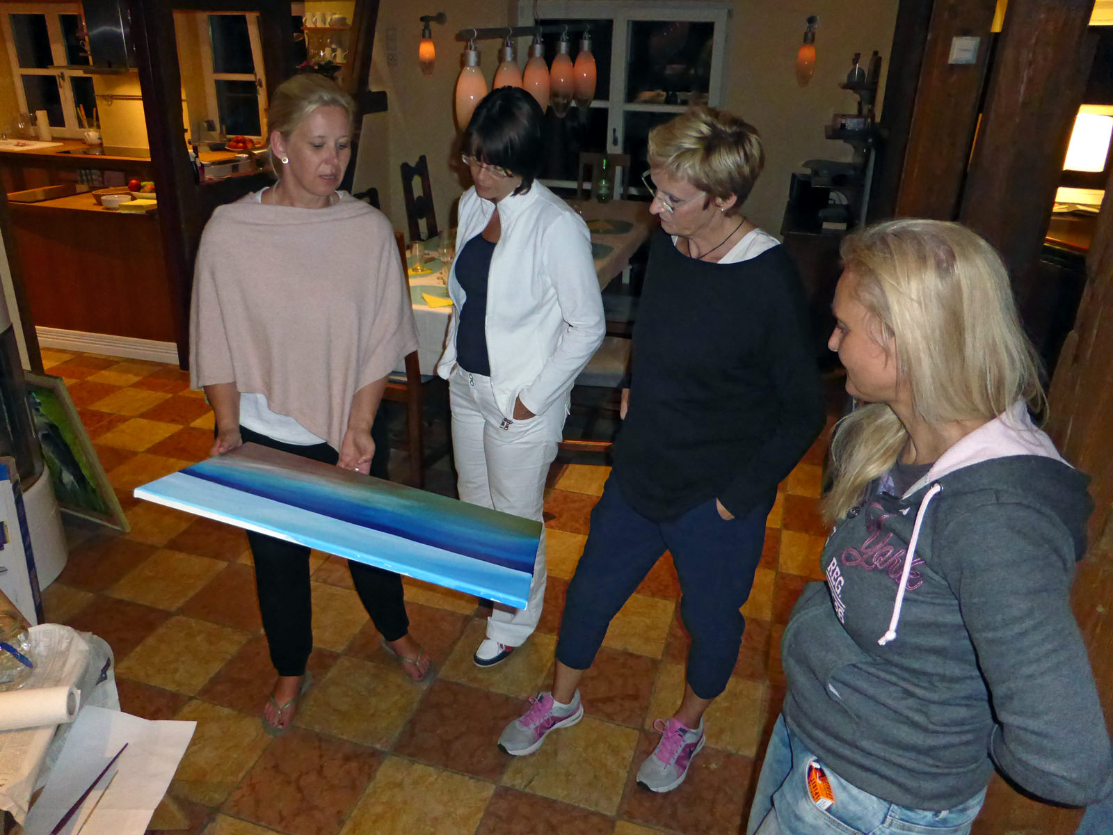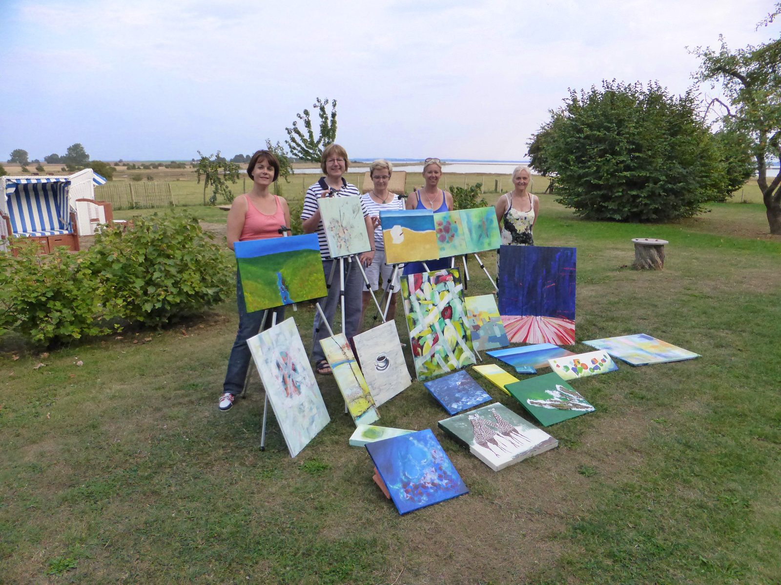 Meine erste Malreise mit einer Gruppe fand 2016 statt und führte uns zur Insel Poel in der Nähe der Stadt Wismar an der Ostsee. In einem großen und luxeriös ausgestatteten Reetdachhaus in Alleinlage am Wasser mit einem großen Garten waren wir wir eine Woche gemeinsam kreativ, haben uns wunderbar erholt und auch der kulinarische Genuss kam nicht zu kurz. Das Haus, die Lage und die Insel gefielen mir so gut, dass ich auch in 2019 und 2020 dir Malreisen dorthin wieder plante.
