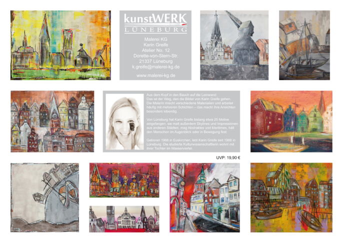 Immerwährender A3-Wandkalender mit 12 der schönsten Lüneburg-Motiven der Künstlerin Karin Greife. Dieser Kalender verjährt nicht und kann unbegrenzt genutzt werden. Solange der Vorrat reicht – viele Exemplare sind leider nicht mehr vorhanden. Als „Goodie“ für die Versandkosten in Höhe von 4,95 € legen wir der Sendung 5 der beliebtesten A6-Kunstpostkarten mit Lüneburg-Motiven bei.
