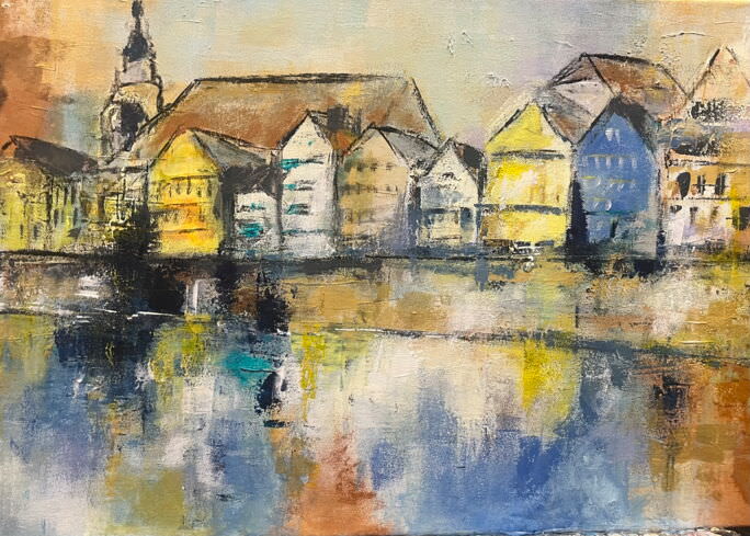 „Neckarfront Tübingen“ (2024) 70 x 50 cm, herbstliche Impression von Karin Greife in Acryl auf Leinwand