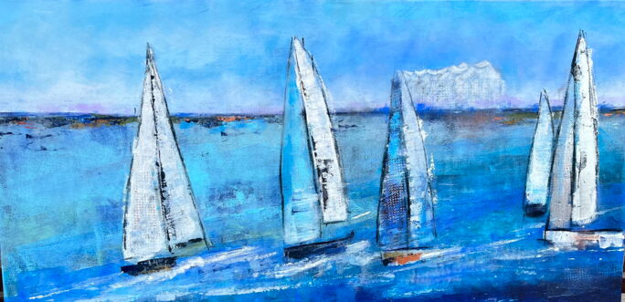 „Alstersegeln) Größe des Originalgemäldes: 120 x 60 cm (2022), Technik: Acryl auf Leinwand.