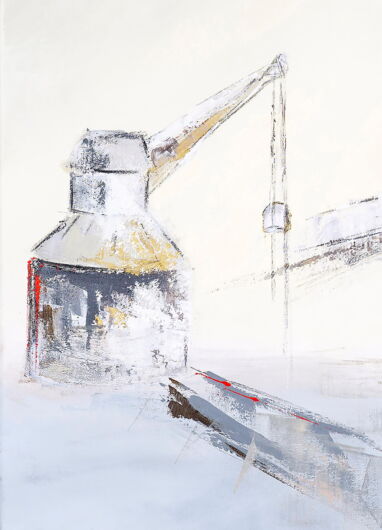 Der Alte Kran Lüneburg, minimiert auf die wesentlichen Elemente. Schön in seiner Einfachheit. Ausschnitt aus dem Gemälde „Lüneburg Viskulenhof Wasserviertel“ (aus 2017) Größe des Gesamtgemäldes: 140 x 100 cm). Helle/ dezente Farben; Weiss, Grau, Beige, helles Grün, rote Akzente. Technik: Acryl-Mischtechnik auf Leinwand.