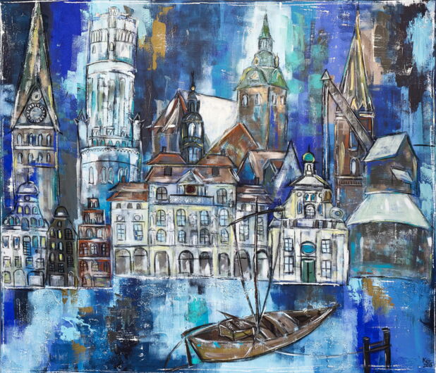 Das Bild zeigt das Panorama von Lüneburg mit den wichtigsten Wahrzeichen in Blautönen, akzentuiert mit Türkis, Braun, Weiss und Ocker. Man sieht die Johanniskirche, den Wasserturm, das Rathaus, die Michaeliskirche, das Alte Kaufhaus, die Nicolaikirche, den Alten Kran, den Ewer im Vordergrund sowie einige Hansegiebelhäuser. Originalgröße des Gemäldes: 140 x 120 cm (2016) , Technik: Acryl auf Leinwand.
