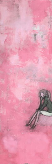Das Bild entstand im Frühjahr 2020 und zeigt eine junge blonde Frau bzw. ein junges Mädchen mit Pferdeschwanz und Rock, die auf einem Stein sitzt vor gelbem Hintergrund. Die Frau ist in den Farben grau, weiss gehalten. Das Bild symbolisiert die Einsamkeit, die die Corona Krise des Jahres 2020 mit sich brachte, gleichzeitig aber auch das „zur Ruhe kommen“, das „nachdenken“.