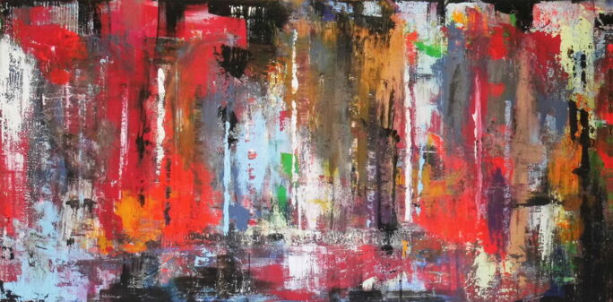 Abstraktes Gemälde in kräftigen Farben. Man erahnt vage eine Skyline mit Wolkenkratzern und ein Großstadtgetümmel. Es überwiegen die Farben Rot, Braun, Ocker, Blau, Schwarz, Gelb, Weiss und Grau. Größe des Originalgemäldes: 60 x 35 cm (2016), Technik: Acrylmischtechnik auf Leinwand.