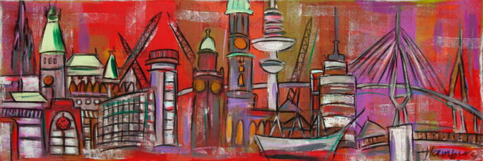 Hamburg Skyline in fröhlichen Farben mit Millerntor, Hafen, Alster, Schiff, Köhlbrandbrücke etc. vor rotem Hintergrund. Als Kunstdruck auf Leinwand beispielsweise schön für Hotels, Ferienwohnungen, private Räume, Büros, Meetingräume oder Touristikunternehmen. Größe des Originalgemäldes: 120 x 40 cm (2013), Technik: Acryl auf Leinwand.