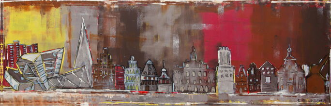 Das Bild zeigt verschiedene alte und neue Gebäude und Wahrzeichen der Stadt Lüneburg in gedeckten Braun-, Rot-, Grau- und Gelbtönen. Zu sehen sind einige Hochhäuser des Stadtteils Kaltenmoor aus den 70erJahren, das vom Stararchitekten Daniel Libeskind um 2010 gebaute Zentralgebäude der Leuphana-Universität, das aus verschiedenen Epochen zusammengesetzte Lüneburger Rathaus (1230 erbaut mit Barock-Fassade von 1720), den Wasserturm, den Alten Kran (um 1797 erbaut) und einige typische Hansegiebelhäuser des Platzes Am Sande aus dem Mittelalter. Die Farben führen von einem Gelb auf der linken Seite über Grautöne in warme Rot- und Brauntöne auf der rechten Seite des Bildes. Größe des Originalgemäldes: 145 x 45 cm (2015), Technik. Acryl auf Leinwand.