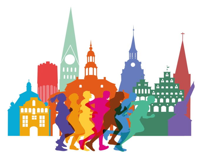 Skyline Lüneburg in fröhlichen Farben mit Läuferinnen und Läufern im Vordergrund