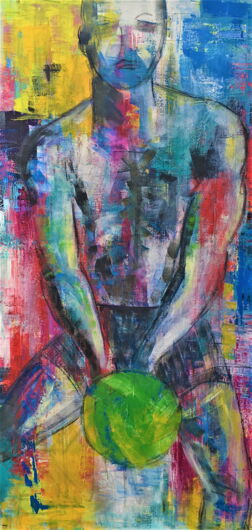 Das Bild zeigt einen jungen, muskulösen Mann mit nacktem Oberkörper und kurzer Hose mit einem grünen Ball. Das Bild ist in kräftigen Farben gemalt. Größe des Originalgemäldes: 70 x 140 cm (2018), Technik: Acryl auf Leinwand. Als Kunstdruck auf Leinwand beispielsweise schön für Sportvereine, private Räume, Freizeiteinrichtungen, Praxen etc.