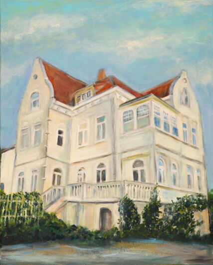 Das Bild zeigt eine der schönen Villen Lüneburgs im Sonnenlicht, realistische Malweise.