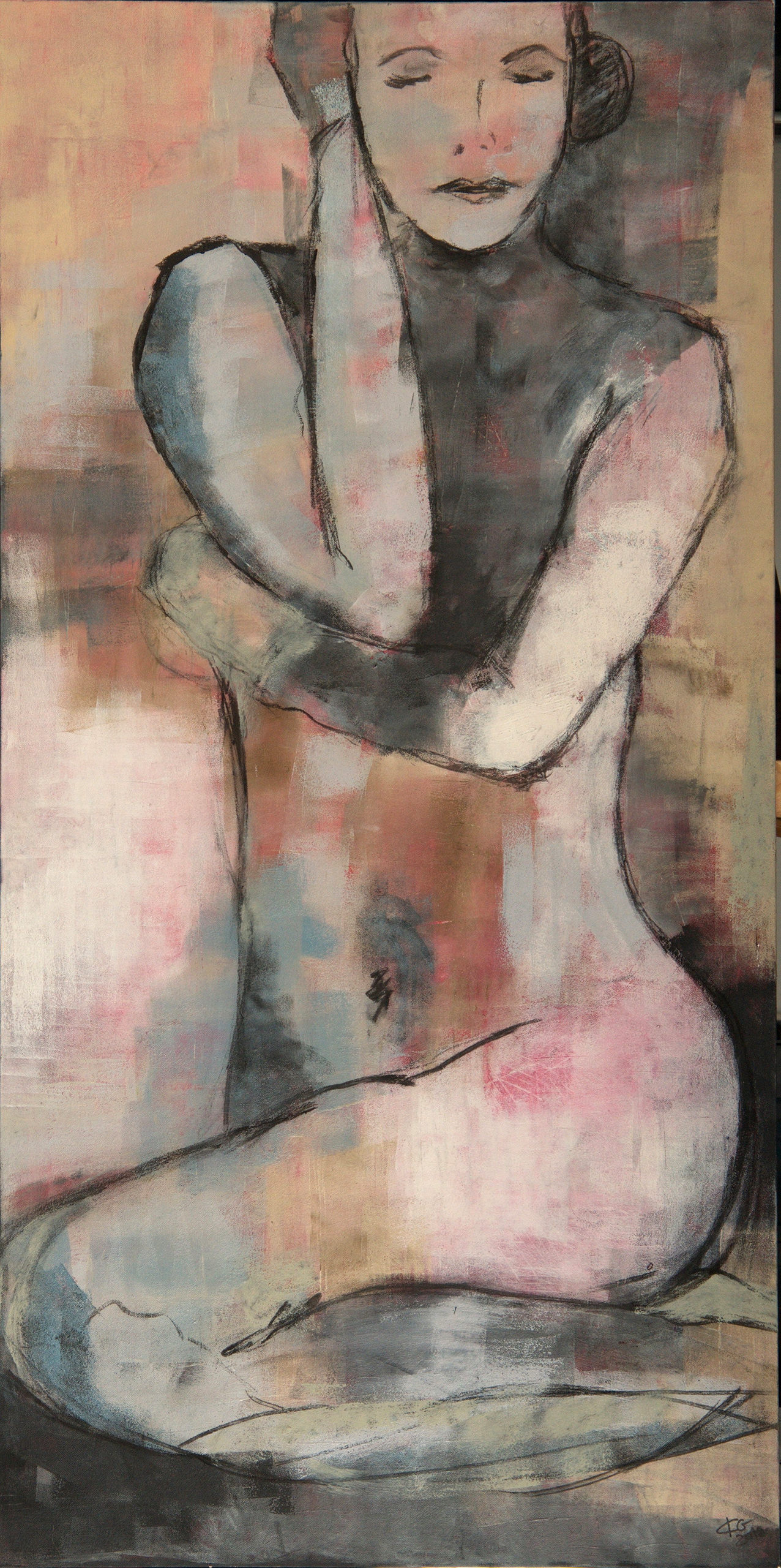 Weiblicher Akt, Frau in Frontansicht in entspannte Haltung und mit geschlossenen Augen. Farben. sanfte Hauttöne mit Grau. Größe des Originalgemäldes: 70 x 140 cm (2018), Technik: Acryl auf Leinwand.