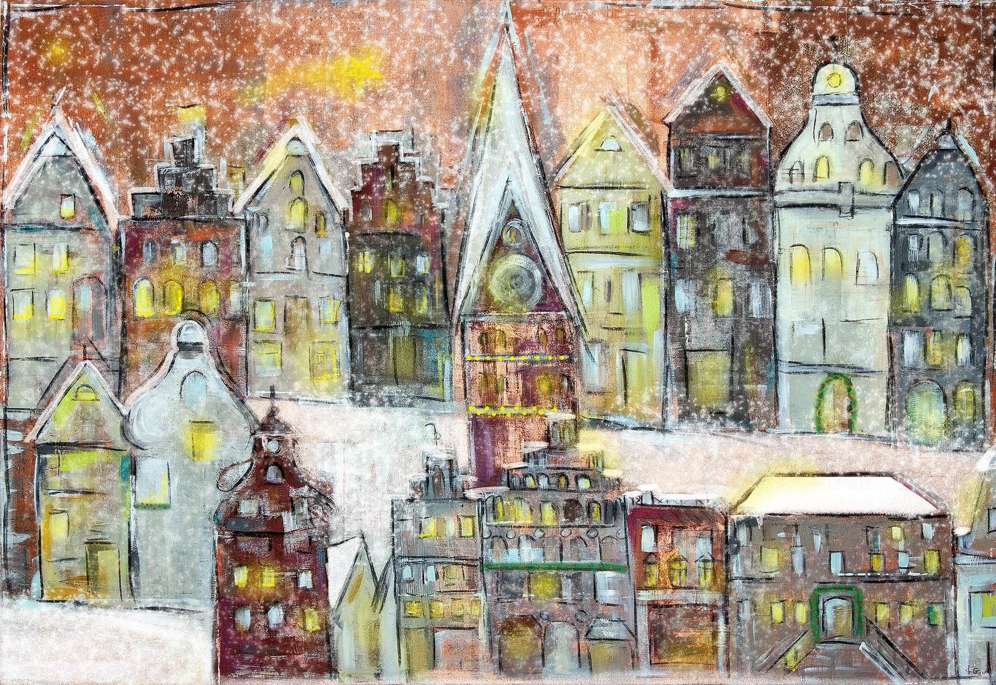 Panorama des Platzes „Am Sande“ Lüneburg mit den typischen Hansegiebel-Häusern zur Weihnachtszeit. Größe des Originalgemäldes: 160 x 110 cm (2014), Acryl-Mischtechnik auf Leinwand.